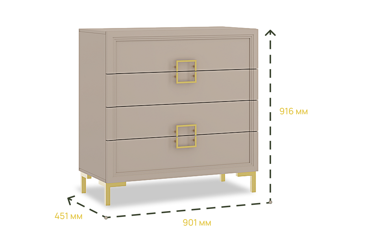 Элегантный лаконичный комод с четкими прямыми линиями будет превосходно смотреться в спальне, гостиной, прихожей, оформленной в стиле ар-деко или минимализм. Четыре выдвижных ящика визуально объединены рисунком квадратных ручек. Изящный сложный оттенок «серый кашемир», фурнитура и опоры «под золото» только усиливают эффектность мебели.