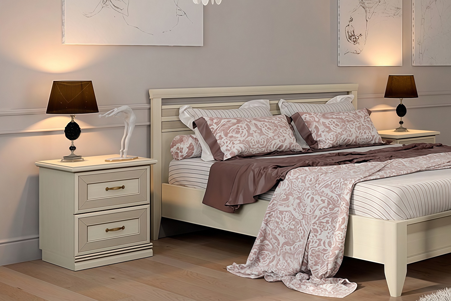 Чтобы сделать интерьер более завершенным, вы можете дополнительно приобрести металлические аксессуары в бронзовых оттенках и абстрактные постеры с яркими акцентами. Для большего удобства композицию можно завершить мягким пуфом или банкеткой в тон мебели. Конечно же, не забудьте про туалетный столик, который сделает утренние и вечерние ритуалы еще приятнее.