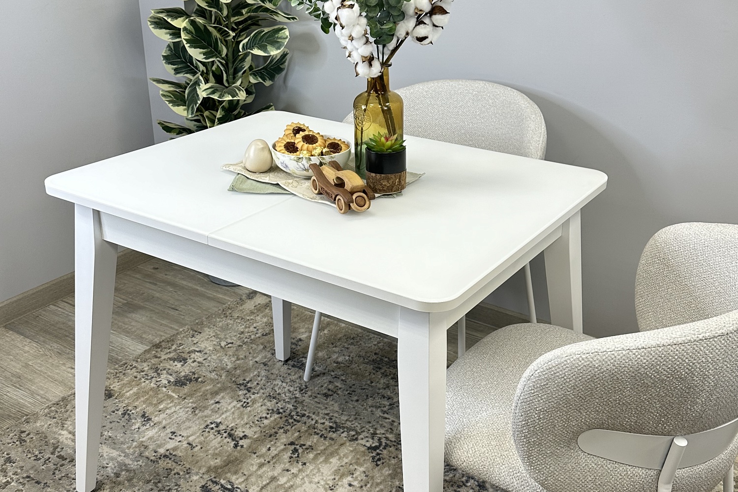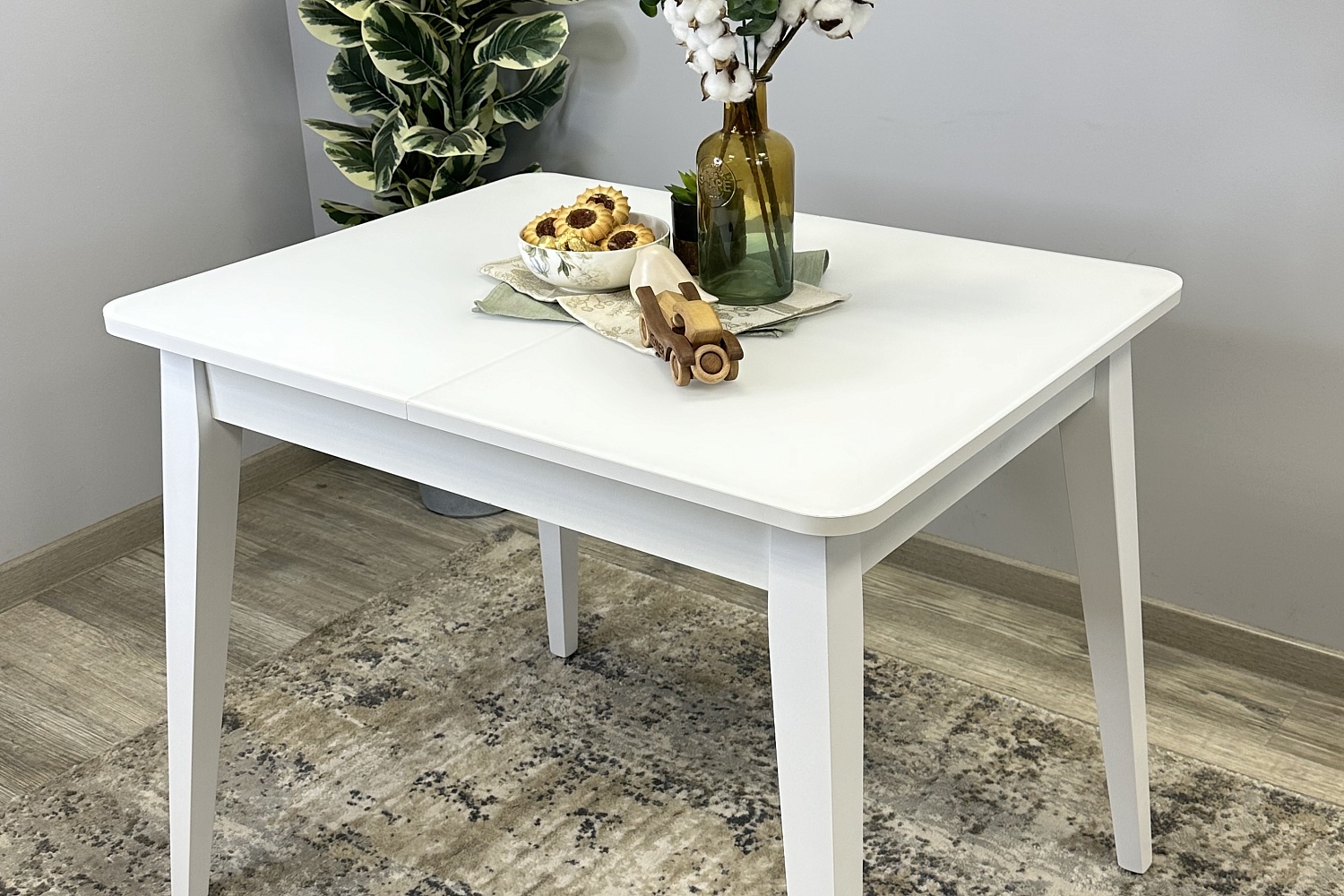 Стол обеденный Орпен квадратный раздвижной 900М опоры белые, столешница - стекло белый сатин.