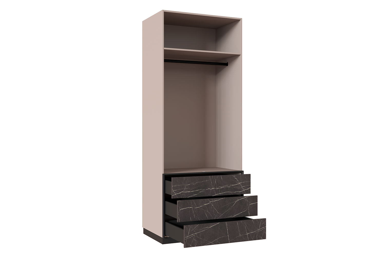Все модули гармонично сочетаются друг с другом. Черный акцентный мрамор добавляет коллекции изысканности и роскоши, а выразительная геометрия тонких черных ручек на фасадах, перетекающая в линию опор, придают ей современный вид.